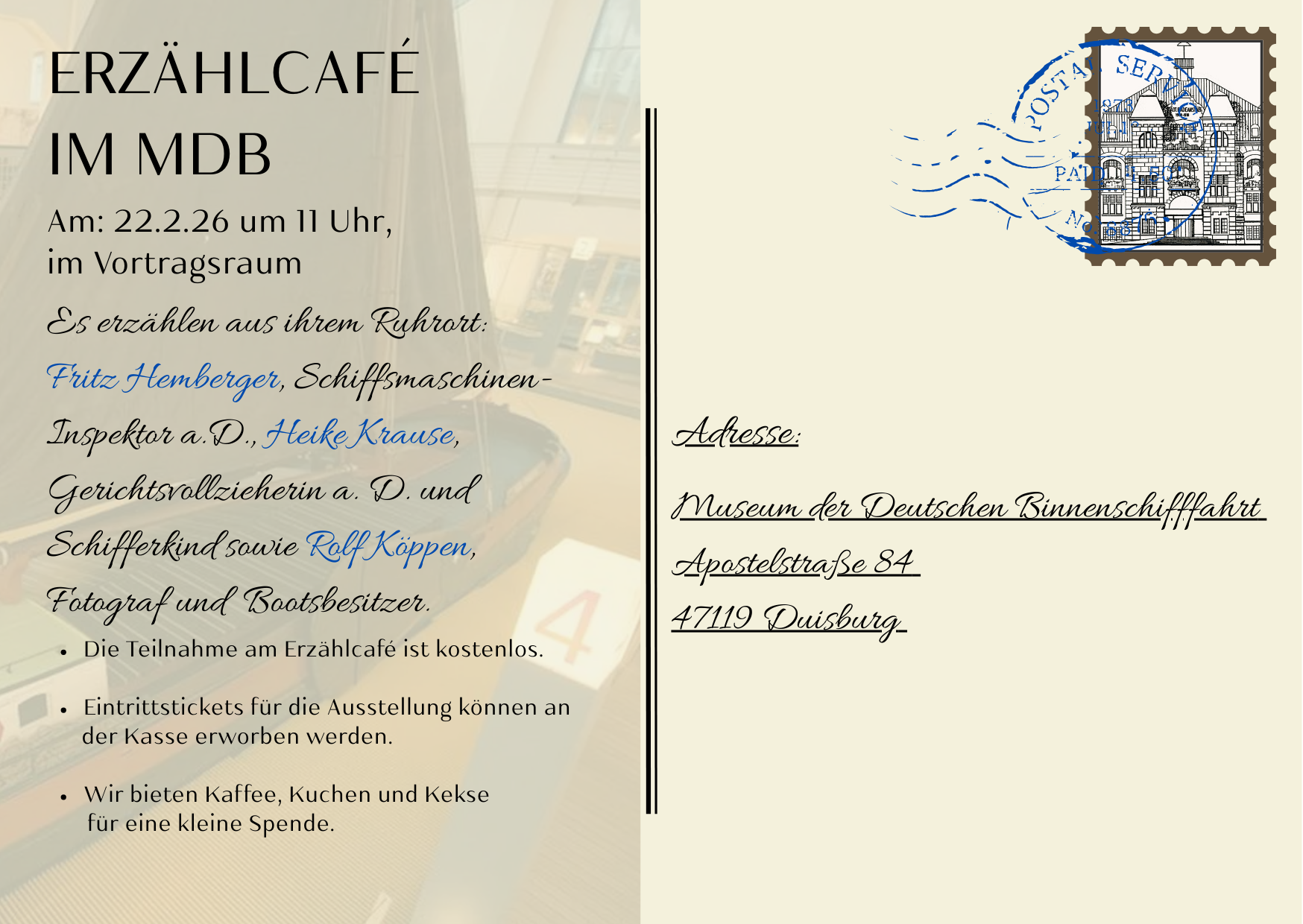 Im Rahmen der aktuellen Sonderausstellung „Gruß aus Ruhrort – Zeitzeugnisse aus der Sammlung Fritz Hemberger“ findet auch unser nächstes Erzählcafé statt: Am Sonntag, den 22. Februar 2026 erzählen Fritz Hemberger, Heike Krause und Rolf Köppen um 11 Uhr, im Vortragsraum des Binnenschifffahrtsmuseums aus ihrem Ruhrort.