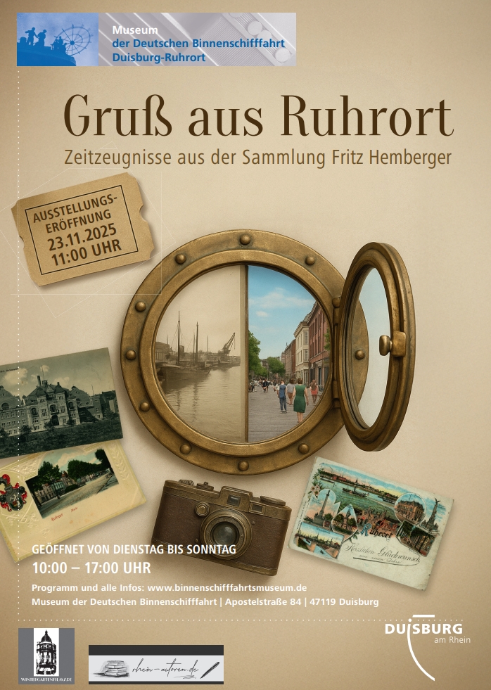 Postkarten erzählen Geschichten: Am 23. November eröffnet das Museum der Deutschen Binnenschifffahrt (MDB) die Sonderausstellung „Gruß aus Ruhrort – Zeitzeugnisse aus der Sammlung Fritz Hemberger“. Im historischen Turmzimmer der „Herrenhalle“ werden bis zum 22. März 2026 rund 50 ausgewählte Postkarten präsentiert, die ein lebendiges Bild Ruhrorts zu Beginn des 20. Jahrhunderts zeichnen.
