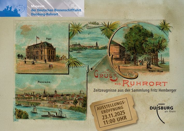 Postkarten erzählen Geschichten: Am 23. November eröffnet das Museum der Deutschen Binnenschifffahrt (MDB) die Sonderausstellung „Gruß aus Ruhrort – Zeitzeugnisse aus der Sammlung Fritz Hemberger“. Im historischen Turmzimmer der „Herrenhalle“ werden bis zum 22. März 2026 rund 50 ausgewählte Postkarten präsentiert, die ein lebendiges Bild Ruhrorts zu Beginn des 20. Jahrhunderts zeichnen.