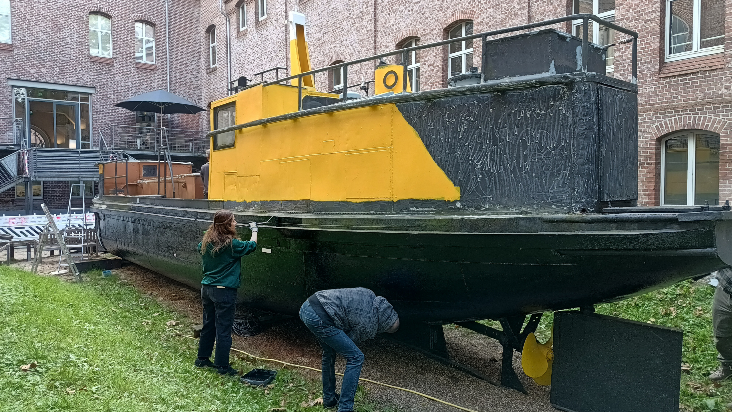 Am 9. Oktober 2025 kamen drei freiwillige Helferinnen und Helfer der Targo Bank zusammen, um den Bilgenentöler im Innenhof des Binnenschifffahrtmuseums in neuem Glanz erstrahlen zu lassen. Von 10 bis 16 Uhr wurden bei trockenem Wetter gemeinsam mit unserem Haustechniker Michael Merkel Malerarbeiten an dem Ausstellungsschiff durchgeführt.